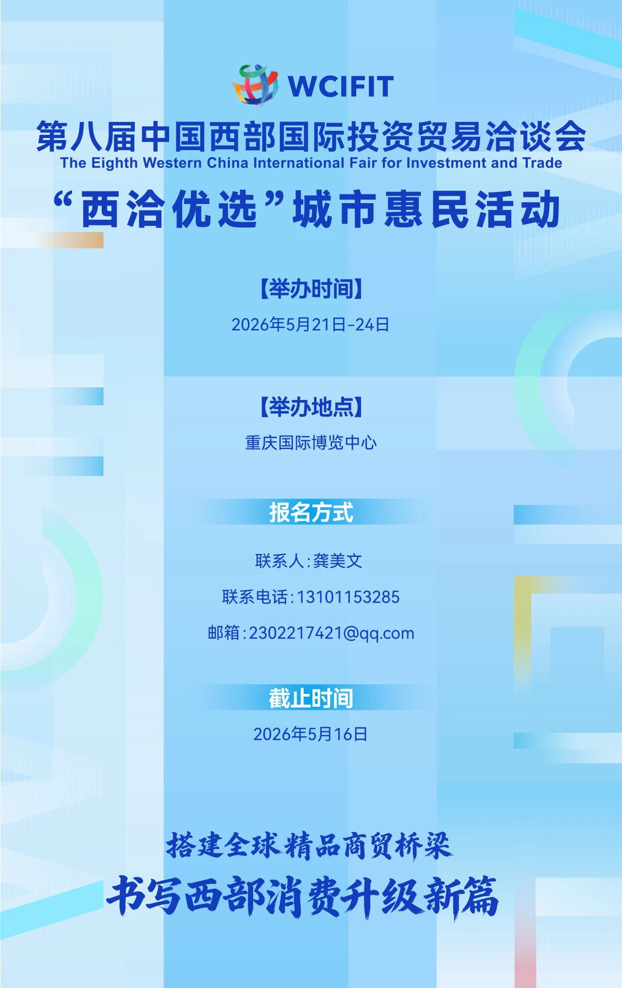 第八届中国西部国际投资贸易即将启幕!为进一步激发消费市场新活力,传播西洽会品牌效应,“西洽优选”城市惠民活动将于2026年5月21日-24日与本届大会同期举行。