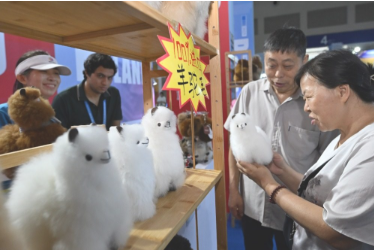 ▲Visitors inquire about alpaca wool exhibits at the Peru Exhibition Zone at the Chongqing International Expo Center, May 23, 2025. Photograph courtesy of Reporter Zhang Jinhui