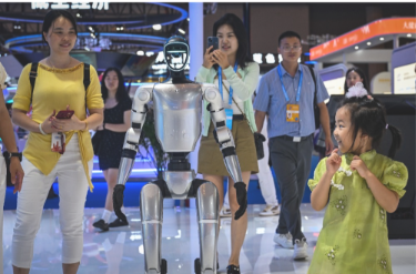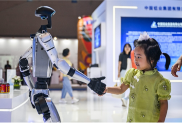 A robot interacts with a young girl by shaking hands at the 7th WCIFIT, Chongqing International Expo Center, May 22, 2025. Photograph courtesy of chief reporter Long Fan