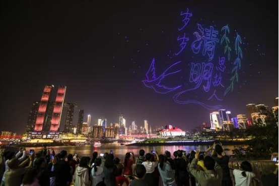 ▲ April 5, 2026, Nanbin Road, Nan'an District, where many national and international tourists gathered along the riverside to watch a drone show. Photo by Reporter Yin Shiyu